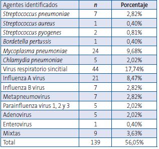Se consiguió identificar el germen causal en 139 pacientes (56,05%) (IC 95: 46,61 a 58,95). El microorganismo más frecuentemente encontrado fue el VRS (17,74%) ( Tabla 4). S. pneumoniae se detectó en siete casos, mientras el ANF para virus fue positivo en 90 pacientes.