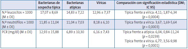 Los parámetros analíticos mostraron cómo la PCR fue significativamente mayor en neumonías bacterianas típicas frente a atípicas y víricas, tal y como muestran estudios similares. Las cifras medias de leucocitos y neutrófilos mostraron diferencias relevantes para apoyar el diagnóstico diferencial entre las neumonías típicas bacterianas y las víricas, pero no con las atípicas, dato que apoya la mayor dificultad actual en la diferenciación de la infección por M. pneumoniae.
