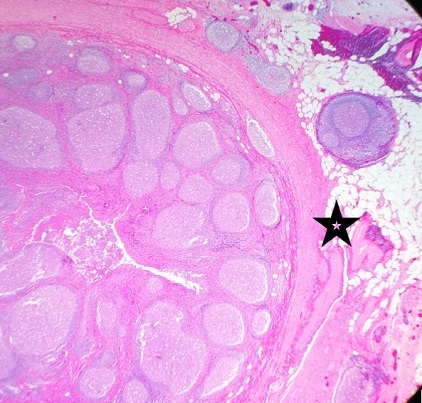 En el estudio de anatomía patológica se observó un apéndice ileocecal de pared engrosada, con áreas de aspecto fibrinoide en la superficie y contenido fecaloideo en su luz. El engrosamiento mural de la pared descrito macroscópicamente se correspondía histológicamente con una marcada hiperplasia folicular linfoide en la submucosa, que se extendía a la capa muscular y la subserosa, sin signos morfológicos ni inmunohistoquímicos de malignidad. La mucosa mostraba áreas de erosión, con inflamación crónica transmural, sin granulomas sugerentes de enfermedad inflamatoria intestinal ( Fig. 1 y Fig. 2). Desde que se realizó la apendicectomía, el paciente ha permanecido completamente asintomático y con exploración física normal en las revisiones realizadas en consulta.