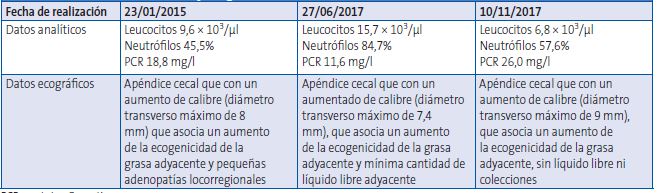 Presentamos el caso de un paciente varón de 12 años de edad, sin antecedentes personales ni familiares de interés patológico, que durante dos años había consultado en tres ocasiones en el centro de salud por episodios de dolor abdominal agudo. El dolor se localizaba en el hipogastrio, con irradiación a la fosa iliaca derecha (FID), asociados siempre a febrícula y empeoramiento al realizar micción, con diarrea en una ocasión. En la exploración física presentaba dolor a la palpación en FID, con signos de irritación peritoneal (Blumberg positivo). Fue remitido para realización de pruebas complementarias en Urgencias del hospital de referencia, encontrando en todas las ocasiones elevación de la proteína C reactiva y hallazgos ecográficos compatibles con apendicitis aguda incipiente ( Tabla 1).