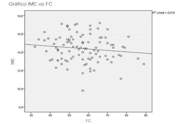 Results: the mean age was similar in both groups: 14.6 ± 2.0 years in cases vs. 14.7 ± 2.0 years in controls. Patients with anorexia had significantly lower heart rates (57 ± 12 vs. 72 ± 13 bpm), a smaller R-wave in V5 (1.1 ± 0.5 vs 1.6 ± 0.4 mV) and a lesser left ventricular mass (65.7 ± 14.8 vs 90 ± 15.3 g/m) compared to controls. We found no differences in the QTc interval. In patients with anorexia, the presence of bradycardia was not correlated to weight (r = -0.20, p = 0.05) or body mass index (r = 0.02, p = 0.22) at admission. We found that the left ventricular mass was significantly correlated to the body mass index (r = 0.21, p <0.001,) and the heart rate (r = -0.225, p <0.001).