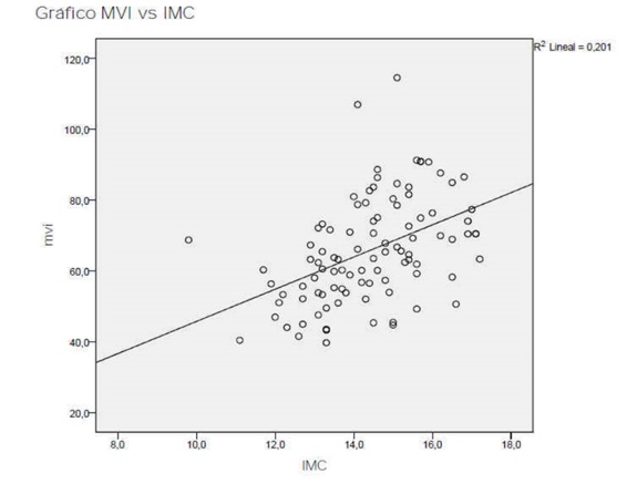 No se observó correlación de la frecuencia cardiaca con el peso (r = -0,20; p = 0,05), ni con el IMC en las paciente con ANR al ingreso (r = 0,0162; p = 0,22) ( Fig. 1). La masa ventricular izquierda sí se correlacionó de forma significativa con el IMC (r = 0,20; p <0,001 ( Fig. 2) y con la FC (r = -0,22; p <0,001).