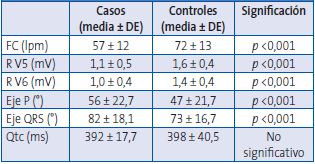 La edad de los pacientes era similar en ambos grupos (casos: 14,6 ± 2,0 años; controles: 14,7 ± 2,0 años, sin significación estadística). El peso (37 ± 5,8 kg frente a 52,2 ± 7,4 kg; p <0,001) y el IMC (14,4 ± 1,4 kg/m 2 frente a 20,2 ± 1,8 kg/m 2; p <0,001) fueron significativamente menores en el grupo de casos. Las pacientes con anorexia nerviosa presentaban menor FC (57 ± 12; 72 ± 13 lpm), voltajes más bajos (rV5 = 1,1 ± 0,5 frente a 1,6 ± 0,4 mV; rV6=1,0 ± 0,4 frente a 1,4 ± 0,4 mV), y mayor desviación de ejes eléctricos a la derecha (eje P: 56 ± 22,7 frente a 47 ± 21,7°; eje QRS: 82 ± 18,1 frente a 73 ± 16,7°) que las pacientes controles. No se encontraron alteraciones significativas en la medición del intervalo QTc ( Tabla 1). El número de pacientes con alteraciones electrocardiográficos en ambos grupos de muestra en la Tabla 2.