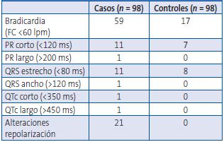 La bradicardia fue el hallazgo más frecuente en pacientes con anorexia nerviosa, estando presente hasta en el 60%. Su distribución por tramos de frecuencia cardiaca en ambos grupos se detalla en la Tabla 3. Además, se encontraron alteraciones de la repolarización en 21 de las pacientes con ANR, con descenso del ST en 1 paciente, alteraciones no específicas del ST-T en 4, y alteraciones no específicas de la onda T en 16. No se hallaron alteraciones en el grupo control de pacientes.
