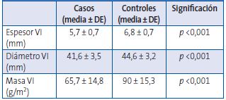 Se realizó, además, un ecocardiograma convencional en todos los pacientes, registrando los siguientes parámetros: espesor, diámetro y masa ventricular izquierda normalizada por superficie corporal.
