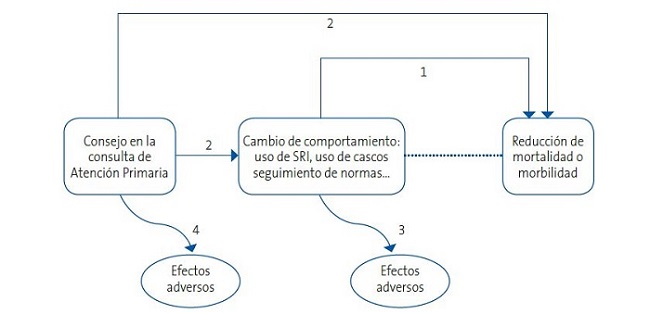 Si bien el uso del casco en ciclistas tiene un balance beneficio-riesgo claramente favorable, la efectividad del consejo en la consulta está poco estudiada 7. Los ensayos clínicos con intervenciones de consejo breve en la consulta son muy escasos o inexistentes para muchas preguntas clínicas, como ocurre en el consejo sobre prevención de lesiones, y en caso de haberlos el riesgo de sesgo es muy alto por factores como las dificultades obvias en el cegamiento de la intervención, el corto seguimiento a que habitualmente se somete a los participantes o los factores de confusión que aparecen en un entorno en donde los pacientes se comunican entre sí, contaminando los grupos. La mayor parte de estudios de intervención en forma de consejo son estudios antes-después, en los que se valoran resultados intermedios: conocimientos adquiridos, actitudes, incluso habilidades adquiridas, pero casi ningún estudio valora accidentes o lesiones.