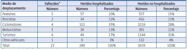 En el grupo de 15 a 17 años la mayoría de los fallecidos eran ocupantes de turismos ( n = 6), seguidos de los motoristas ( n = 5) y los peatones ( n = 5). Respecto a los heridos hospitalizados, el 35% fueron usuarios de ciclomotor, seguidos de peatones (20%) ( Tabla 5).