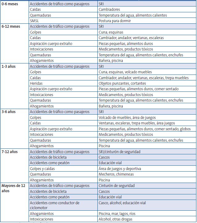 El documento Consejo en la consulta sobre prevención de lesiones no intencionadas expone la guía anticipatoria de la AAP, destacando en primer lugar, en todas las visitas de salud infantil, el consejo sobre prevención de lesiones de tráfico 9.