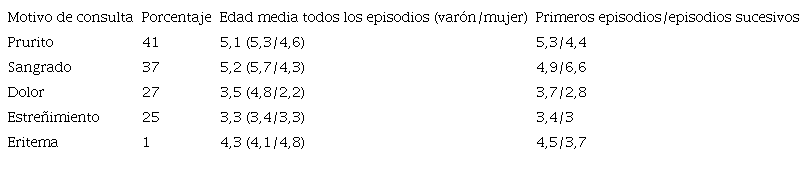 Cinco motivos de consulta (prurito, sangre con la defecación o perianal, dolor perianal o con la defecación, estreñimiento y eritema perianal) solos o combinados, estuvieron presentes en el 92% de los diagnósticos. Relacionando los motivos de consulta en los primeros episodios con el género: el eritema perianal y el prurito se consultan con más frecuencia en el grupo de varones; si los relacionamos con la edad: esta tiende a ser menor cuando el motivo de consulta es estreñimiento y mayor en el caso de prurito. El dolor es motivo de consulta a menor edad en las niñas que en los niños.