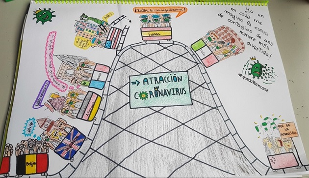 El dibujo de la Fig. 4 llama especialmente la atención por la originalidad y optimismo. La niña representa la curva de contagio como una atracción de feria, concretamente como una “montaña rusa” en la que los distintos países y personas, representados por su bandera y monumentos emblemáticos, van pasando por las fases evolutivas de la pandemia hasta llegar al punto de origen, en el que las mascarillas ya son lanzadas al aire.