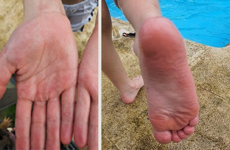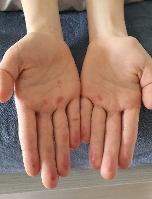Cuadro clínico: la familia consulta por la aparición de eritema palmoplantar inespecífico que no ocasiona molestias al niño y sin otros síntomas acompañantes (Fig. 6-7). A las 24 horas aparecen máculas en las manos, de bordes definidos, rojo-violáceas y dolorosas (Fig. 8).