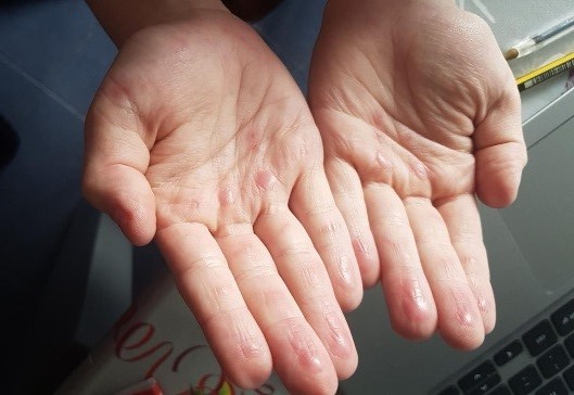 Contexto epidémico familiar: un hermano de 14 años desarrolló lesiones semejantes a los 4 días. El padre en días posteriores inició diarrea leve. La PCR y los test rápidos en ambos para SARS-CoV-2 fueron negativos.