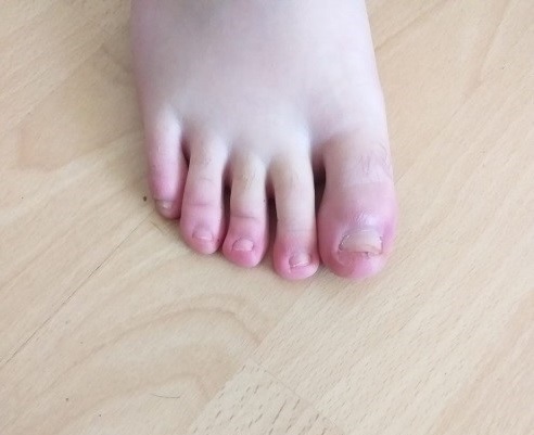 Evolución: tras dos semanas persisten mínimas lesiones residuales en los dedos (Fig. 4-5), pero la familia comenta que ahora tiene frialdad distal llamativa en extremidades, en ocasiones acrocianosis y livedo reticular en manos.