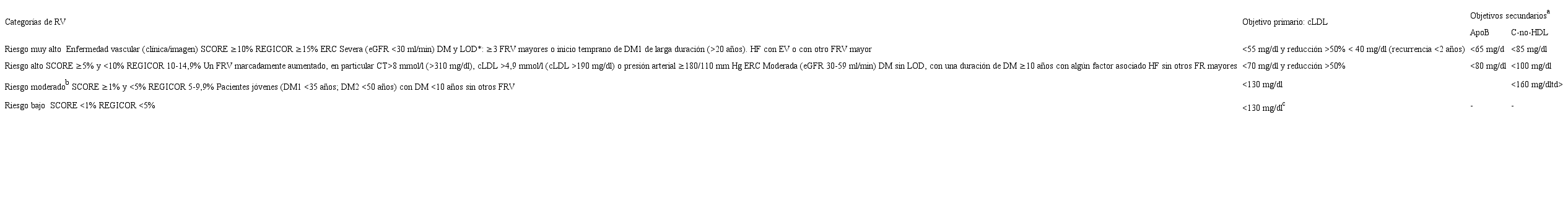 En la Tabla 1 podemos ver las categorías de RV y objetivos de control lipídico propuestos por la reciente guía para el manejo de las dislipemias de la Sociedad Europea de Cardiología (ESC) y de la Sociedad Europea de Arteriosclerosis (EAS) y adaptada por el CEIPV49. El CEIPV quiere resaltar y matizar algunos aspectos: