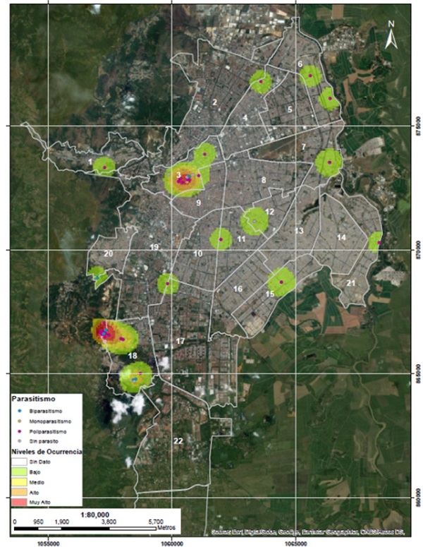 Tratar de analizar y discutir los factores del entorno que probablemente contribuyeron a la prevalencia de enteroparasitismo en los menores considerando los resultados de la distribución espacial y los datos socioeconómicos de las comunas donde residen los menores puede ser arriesgado, dada la diversidad ambiental presente en los sectores de la ciudad de Santiago de Cali y su división político-administrativa, comunas. Sin embargo, un reporte de la ciudad mostró que las enfermedades trasmitidas por inadecuada manipulación de alimentos y condiciones higiénicas sanitarias deficientes se presentan en mayor número de eventos en comunas con desventajas económicas, como en las que residían varios de los menores incluidos en el estudio26. Vale la pena resaltar que la comunidad Nasa, una de las más dispersas en el municipio, se localiza en donde cuentan con un buen balance de la oferta y demanda de agua potable pero también en donde esta es deficiente26. Con relación a este último punto, aquellos menores Nasa residentes en las comunas 3, 11 y 15 tienen restricciones en la calidad y suministro de agua por efectos de almacenamiento y bombeo, razón por la cual la disponibilidad tiene restricciones27. Esto se convierte en un factor de riesgo para el parasitismo intestinal, por el mal almacenamiento del recurso hídrico25. Asimismo, los núcleos familiares de las comunidades Misak y Quichua ubicados en las comunas 3, 18 y 20, se localizan en los sectores con estratos modas que van desde el 1 hasta el 326. Luego son familias de escasos recursos, que residen en inquilinatos, formas de vivienda muy común en estratos socioeconómicos bajos o en su defecto en asentamientos subnormales, con piso en tierra, paredes con todo tipo de material y acceso a servicios básicos no atendidos por la municipalidad14. Estos grupos son doblemente afectados, por un lado, por sus circunstancias históricas y por otro, por las condiciones actuales en las que se encuentran correspondientes a su posición socioeconómica, étnica y política, condiciones materiales y relacionales en la interacción centro-periferia27.