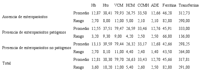 Conclusions: there is a high prevalence of global intestinal parasitism, particularly, there is a significant mild-moderate infestation caused by helminths; in general terms, anemia did not predominate in the study population and no significant associations were found between this and pathogenic parasites.