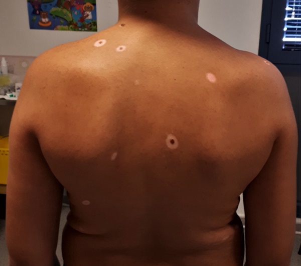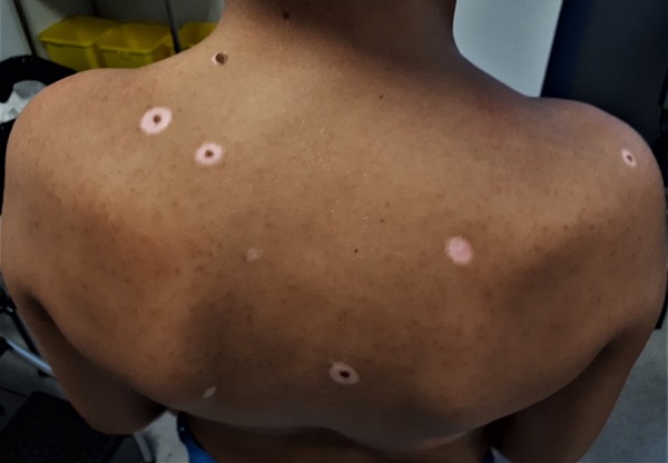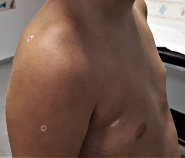 A los diez años presenta lesión compatible con halo nevus, contándose a los 12 años 17 de estas lesiones en el tronco y las extremidades superiores. Los nevus no son sospechosos de malignidad y se realiza controles anuales en dermatología. El niño no refiere prurito y no precisa tratamiento. (Fig. 1, Fig. 2 y Fig. 3 ).