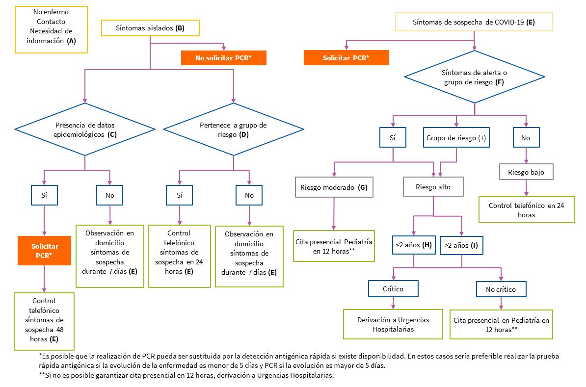 So far, the data collected in the cases of clinical processes caused by the SARS-CoV-2 (COVID-19) coronavirus in children suggest that they are mild compared to infections in adult patients; However, serious cases such as multisystemic inflammatory syndrome (SIM) have been reported, which requires assessment and emergency action. In the context of the of the Primary Care pediatrician consultation and coinciding with the beginning of the school year, at a time when the incidence of influenza, RSV infection and other respiratory conditions usually increases, consultations for symptoms that can lead to suspect these infections. Therefore, it is important to reach a diagnosis that allows the most appropriate management of the patient and decreasing the community transmission by taking pertinent measures. Given that there are no valid scales that offer a score to assess which is the most appropriate action in the event of a suspected COVID-19 infection, we propose the benefits of a clinical decision algorithm that takes into account epidemiological connotations, based on clinical severity to offer the most appropriate clinical care to patients.