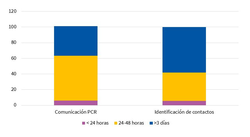 La identificación de contactos estrechos tarda más de 3 días en el 58% de la población y solo a un 5,5% se le comunica en las primeras 24 horas (Fig. 1).