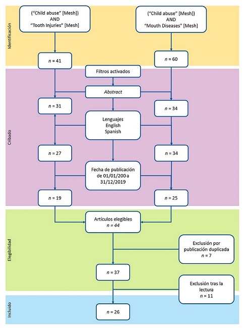 En la búsqueda 1 se utilizó la ecuación ("Child Abuse"[MeSH]) AND "Tooth Injuries"[MeSH]. En la búsqueda 2 se utilizó la ecuación ("Child Abuse"[MeSH]) AND "Mouth Diseases"[MeSH]. En ambas búsquedas se activaron los siguientes filtros: Abstract (hasabstract[text]; Languages (English[lang] OR Spanish[lang]); Publication dates from 2000/01/01 to 2019/12/31 ("2000/01/01"[PDAT]:"2019/12/31"[PDAT]).