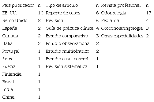 La Tabla 1 muestra el país publicador, el tipo de artículo y el ámbito profesional de la revista en que se publicaron los 26 artículos incluidos en el estudio de revisión. El 38,5% (n = 10) de los artículos fueron publicados por EE. UU. En España se ha publicado el 7,7% (n = 2). Respecto al tipo de artículo, los más numerosos fueron el reporte de casos y las revisiones, con seis artículos cada uno. En cuanto al ámbito profesional de la revista publicadora, el 65,4% (n = 17) se publicaron en revistas de Odontología y el 16% (n = 4) en revistas de Pediatría.