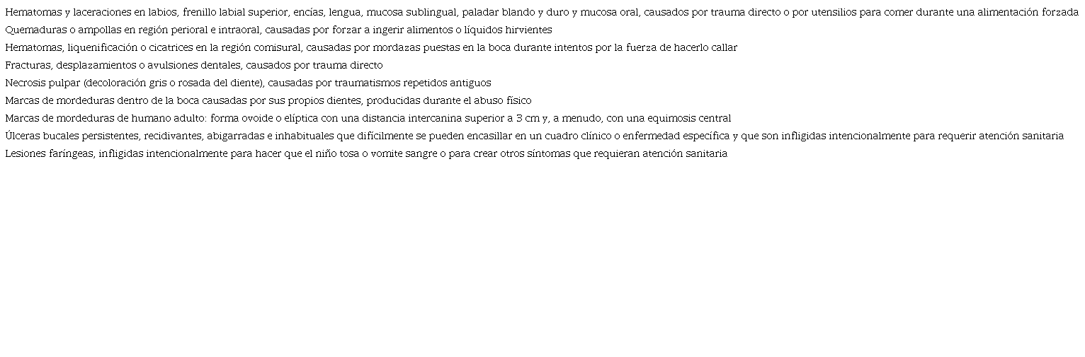 Las lesiones orales e intraorales más frecuentemente observadas (46-95%) son los hematomas y laceraciones en los labios, frenillo labial superior, encías, lengua, mucosa sublingual, paladar blando y duro, y mucosa oral causados por trauma directo o por utensilios para comer durante una alimentación forzada, y las quemaduras o ampollas en región perioral e intraoral causadas por forzar a ingerir alimentos o líquidos hirviendo5,6,7,8,9,10,11,12,13,14,15,16,17,1819.