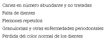En la Tabla 3 se describen las enfermedades y trastornos orales y dentales observados en casos de negligencia en el cuidado y atención bucodental. Todos son sugerentes, pero ninguno es patognomónico. Por ello, es necesario conocer si existen factores considerados necesarios para establecer el diagnóstico de negligencia dental, si existen otros problemas de salud derivados de una negligencia física crónica en la alimentación, higiene, seguridad en el hogar o cuidados básicos de Atención Primaria de salud, y si existen otros indicadores físicos o comportamentales de abuso físico o sexual5,6,12,13,16,20,21,22,23,2425.