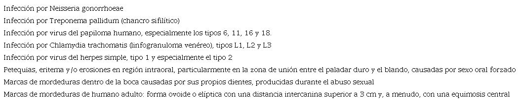 Aunque la cavidad oral es un sitio frecuente de abuso sexual en niños, las enfermedades y lesiones orales visibles son poco frecuentes y difíciles de detectar. Solo se pueden considerar específicas de abuso sexual las infecciones orales por Neisseria gonorrhoeae y Treponema pallidum. Todas las demás lesiones y enfermedades son sospechosas o sugerentes de abuso sexual, pero no patognomónicas6,12,16,17,22,26,27,28,2930.