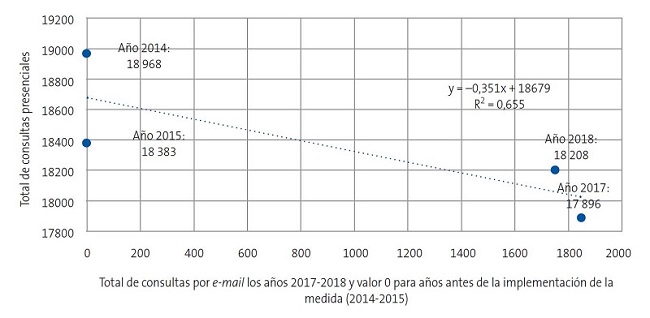 En la Fig. 2, se observa una correlación negativa entre el total de consultas presenciales y por CE de los años 2014-2015 (18 968 y 18 383 consultas presenciales) y 2017-2018 (17 896 y 18 208 consultas presenciales). No tenemos en cuenta el año 2016 (año de implantación, con un total de 12011 consultas presenciales) porque resulta atípico respecto a la experiencia acumulada.