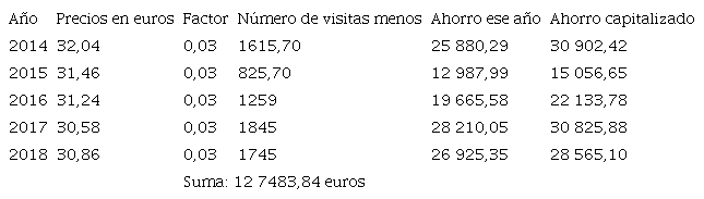 También se estima el ahorro que ha supuesto la implantación de la medida para los años 2016-2018 (basándonos en datos reales de consultas de CE) y para los años 2014-2015 (basándonos en la primera estimación de número de consultas presenciales). El ahorro total es el sumatorio del ahorro capitalizado de todos los años.
