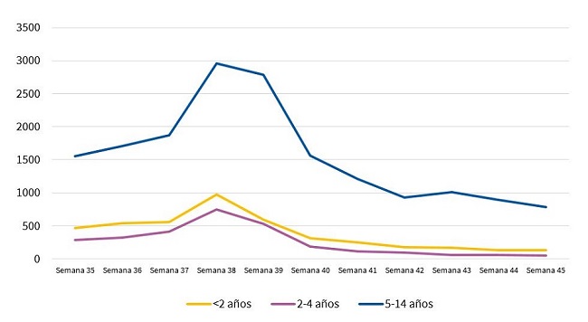 Contrariamente a lo esperado, los informes de la Comunidad de Madrid muestran un claro descenso de los casos pediátricos a partir de la semana 39 (21 de septiembre), una vez incorporado a las aulas el grueso de estudiantes madrileños (Fig. 4 y Fig. 5), lo que llevó al Gobierno autonómico a suspender la realización de pruebas diagnósticas en contactos escolares asintomáticos a partir de la semana 41 (5 de octubre), tras la publicación, el 2 de octubre, del nuevo Protocolo de actuación ante la aparición de casos COVID-19 en centros educativos de la Comunidad de Madrid.