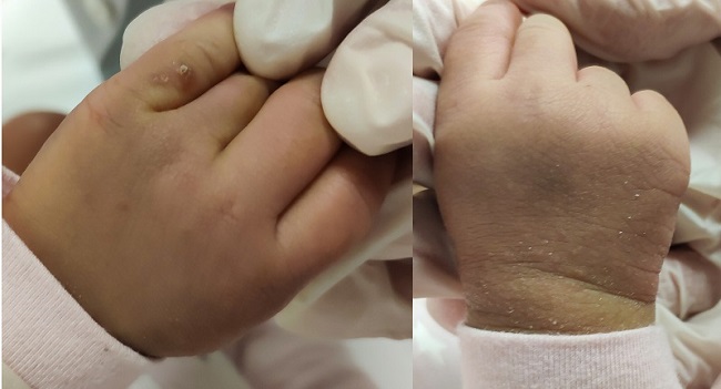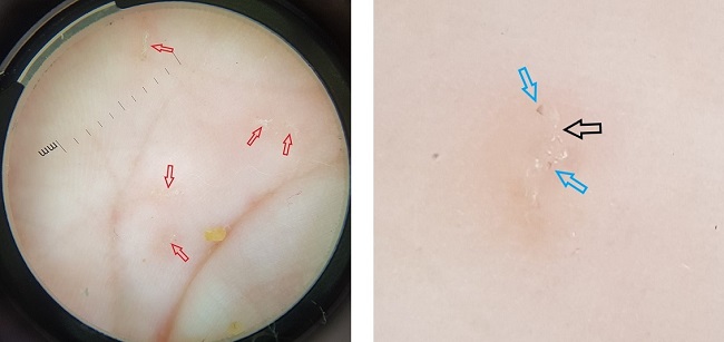Abstract: Scabies, a skin infestation caused by Sarcoptes scabiei var. hominis, is generally easy to diagnose because of its characteristic clinical features. The diagnosis can be confirmed by the Müller test or by dermoscopy, a non-invasive, painless, and highly accurate technique. We present a representative case of infantile scabies with pathognomonic dermoscopic findings, in a 6-month-old girl referred for evaluation of a 2-week dermatitis. Under suspicion of scabies, a dermoscopy examination was performed, confirming the diagnosis by showing a distinctive dermoscopic feature composed of a S-shaped furrow with a triangle on one of its endings, known as delta wing jet sign. In addition, Müller test was performed, observing the mite on direct microscope examination after scraping one of the skin injuries. This case is a reminder of the typical clinical presentation of scabies in infants and the main methods that allow us to confirm the diagnosis. We want to highlight the usefulness of dermoscopy, as it is a simple and innocuous technique.