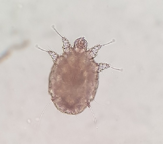 Con la sospecha de escabiosis, realizamos examen con dermatoscopia de luz polarizada (DLP), observando múltiples lesiones en forma de surco lineal curvado que finaliza en una estructura triangular marrón (Fig. 2). Además, realizamos raspado de piel (test de Müller) de las zonas donde observamos el triángulo marrón, y visión directa con microscopio óptico, visualizándose varios parásitos (Fig. 3), huevos y heces. Con el diagnóstico de escabiosis, pautamos tratamiento tanto a la paciente como a sus convivientes con permetrina en crema al 5%, repitiendo la aplicación a la semana, además de medidas de higiene, con resolución completa de las lesiones tras este.