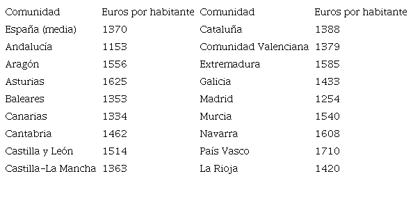 El punto de partida para analizar las inequidades del Estado español es el gasto sanitario público por habitante. Existe diferencia del gasto por habitante en salud, ya que, aunque la media de las comunidades autónomas es de 1370 euros/habitante/año, tiene unos márgenes amplios que varían entre los 1710 del País Vasco y los 1153 de Andalucía con una diferencia del 30% entre ambas comunidades (Tabla 1).
