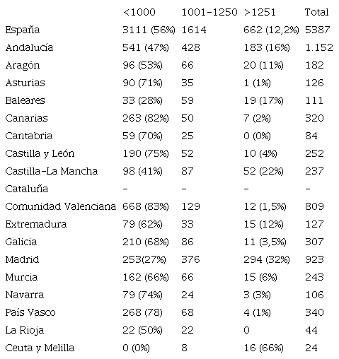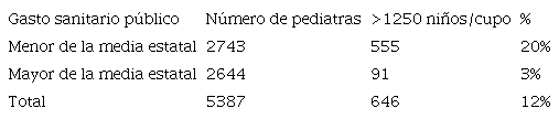 Las Comunidades con un gasto por habitante menor de la media son: Andalucía, Baleares, Canarias, Castilla-La Mancha y Madrid y el 20% de sus cupos son mayores de 1250 niños; mientras que en las que tienen un gasto sanitario por habitante mayor de la media (Aragón, Asturias, Cantabria, Castilla y León, Valencia, Extremadura, Galicia, Murcia, Navarra, País Vasco y La Rioja) solo el 3% de los cupos de Pediatría son mayores de 1250 niños/pediatra (Tabla 3). Estos datos explican como la disminución de la financiación se relaciona con el exceso de cupos y por ende con la inadecuada atención de los niños. Supone en sí mismo una inequidad (no hay datos disponibles de Cataluña).