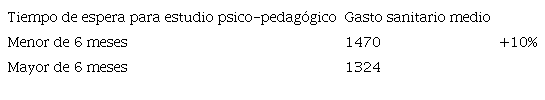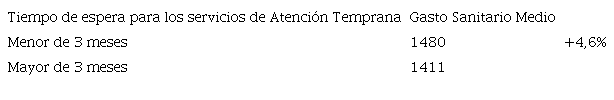 Comparando el gasto sanitario medio por persona de estas 6 comunidades, con las otras 12 comunidades, observamos que el gasto por habitante es un 4,6% menor de media en las comunidades en las que la espera para ser atendido en los servicios de Atención Temprana superan los 3 meses (Tabla 5).