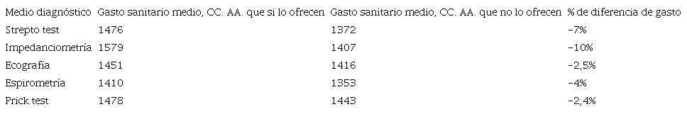 Las espirometrías, imprescindibles para el control de los niños asmáticos en Atención Primaria, no se dispone en La Rioja y existe de manera desigual, en las CC. AA. de: Andalucía, Castilla y León, Castilla-La Mancha, Cataluña, Baleares y Valencia. Disponen de prick test, para diagnóstico de alergias, bien sea en todas las áreas o de manera desigual en las comunidades de Cantabria, País Vasco, Cataluña y Baleares. La comparación de todos estos métodos diagnósticos y el gasto por habitante se encuentra en la Tabla 7.
