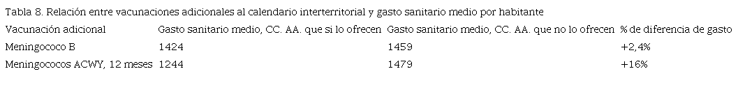 Así como en el resto de los aspectos analizados la oferta de servicios era mayor en las comunidades con mayor gasto sanitario, en este aspecto ocurre lo contrario. Las comunidades que ofrecen vacunaciones adicionales tienen un menor gasto sanitario por persona que las que no las ofrecen (Tabla 8).