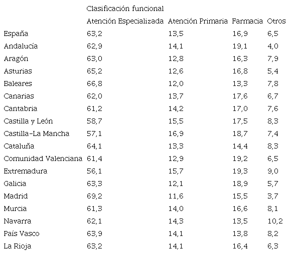 Según los datos del Ministerio de Sanidad, el gasto medio en Atención Primaria es del 13,5%, mientras que el de especializada es del 63,2% casi cinco veces más. El porcentaje que se dedica a Atención Primaria varía desde el 12% de las Islas Baleares al 16,9% de Castilla-La Mancha (Tabla 9).