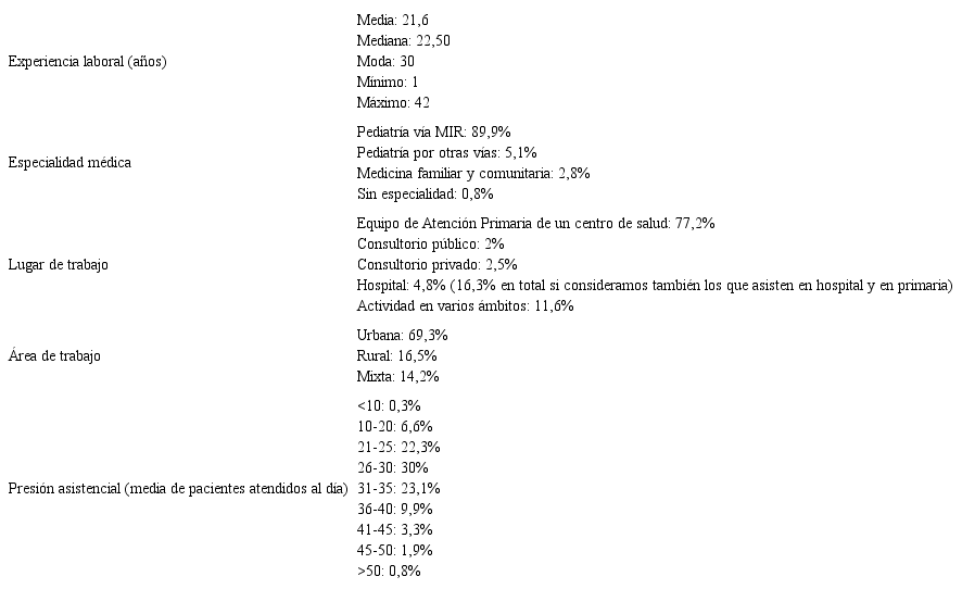 La base de datos se diseñó en Microsoft Excel. El estudio estadístico se realizó con el programa SPSS 20.0 para Windows. Se relacionaron con los resultados de la encuesta las siguientes variables: experiencia laboral (en años), especialidad médica (Pediatría vía MIR frente a otras formaciones), área de trabajo (urbana frente a rural frente a mixta) y presión asistencial (número de pacientes atendidos al día).