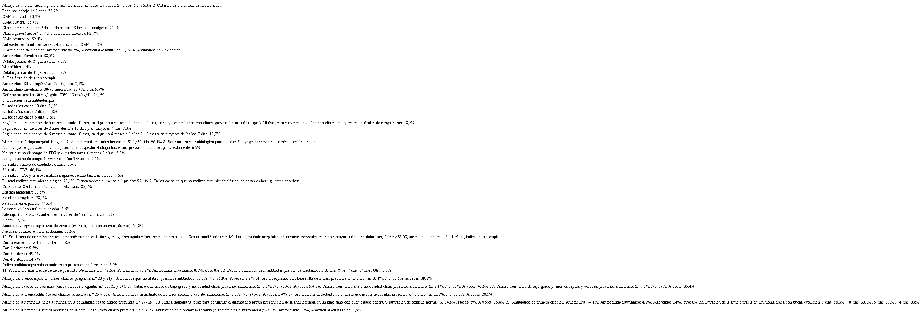 Resultados: Se obtuvieron 362 encuestas. El 53,1% de los encuestados atiende de 25-35 pacientes al día. La puntuación media de respuestas correctas es de 18,8/23. En otitis media aguda, la indicación de antibioterapia y su duración se realiza según distintos criterios con porcentajes variables, el 98,6% usa amoxicilina, el 97,2% a dosis correctas. En faringoamigdalitis realiza test microbiológico el 79,1%, trata con amoxicilina 50,8% o penicilina 48,6%, durante 10 días el 84%. En patologías respiratorias de etiología vírica (broncoespasmo, catarro y bronquiolitis), más del 90% no indica antibióticos; sin embargo, la presencia de fiebre alta o secreciones verdosas aumenta su prescripción. En neumonía típica, hasta el 59,6% no realiza radiografía, recetan amoxicilina el 94,1%, durante 7 días el 68,3%. En neumonías atípicas el 97,8% prescribe macrólidos. Se observa relación estadísticamente significativa entre: experiencia laboral y puntuación en la encuesta y realización de radiografía; especialidad y calificación del cuestionario, y presión asistencial con realización de test microbiológico en faringoamigdalitis.