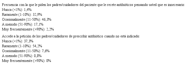 En la Tabla 4 se presentan las respuestas a las cuestiones relacionadas con la impresión por parte de los padres o cuidadores acerca del uso de antibióticos y la presión que ejercen sobre los profesionales.