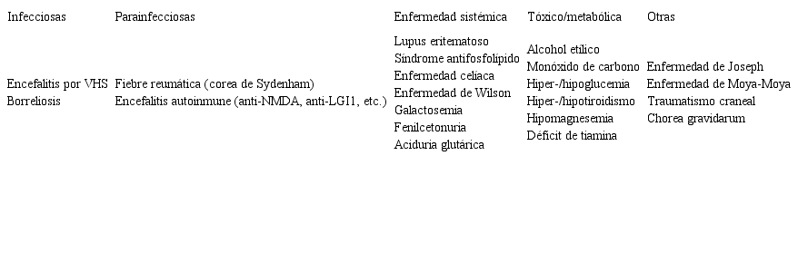 Presentamos este caso clínico con el objetivo de documentar que, a pesar de ser una entidad muy infrecuente en la actualidad, siendo las referencias bibliográficas casi excepcionales en los últimos 10 años, se debe reconocer la presentación clínica del corea Sydenham1. Ante un cuadro de inicio agudo de corea en la infancia o adolescencia, se deben considerar todas las posibles causas (Tabla 1)2,3. Es importante investigar antecedentes familiares de enfermedad neurológica (corea de Huntington), endocrinológica o reumatológica y excluir origen secundario a fármacos y tóxicos. En todos los casos se deben descartar alteraciones iónicas, hiper- o hipoglucemia así como condiciones asociadas como hepatopatía o hipertiroidismo. En la orientación diagnóstica resulta fundamental la realización de una prueba de imagen (de elección la RM cerebral, por detectar mejor los cambios inflamatorios) que permita detectar causas subyacentes (lesiones estructurales o vasculares), así como punción lumbar para descartar infección o inflamación a nivel del sistema nervioso central. Posteriormente se ampliará el estudio según la sospecha clínica4. En los últimos años se han descrito varias mutaciones que se relacionan con corea familiar5.