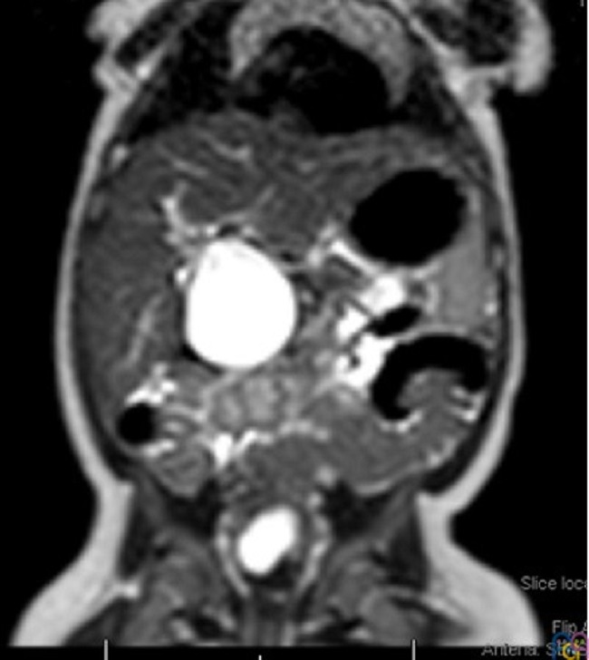 Se realiza ecografía abdominal (Fig. 1), donde se objetiva una marcada dilatación del colédoco, con morfología quístico-fusiforme, que se extiende desde hepático común hasta región pancreática, sugestivo de quiste de colédoco tipo IA según la clasificación de Todani, con barro biliar y leve ectasia de la vía biliar intrahepática. Se completa el estudio con una colangiorresonancia magnética (Fig. 2), donde se visualiza una lesión quística bien definida y redondeada del conducto colédoco en su totalidad, de 4,6 × 3,5 × 3,3 cm, sin extensión a vía biliar intrahepática, confirmando la sospecha diagnóstica inicial.