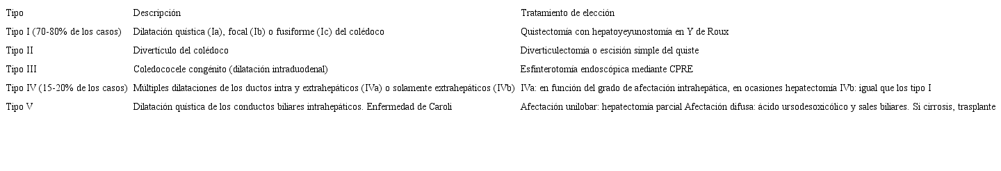 El abordaje específico va a depender del tipo de quiste (Tabla 1), pero de forma general, el objetivo es doble: escisión del quiste y restablecimiento del drenaje bilioentérico de forma directa al duodeno o mediante hepatoyeyunostomía en Y de Roux1,2,4.