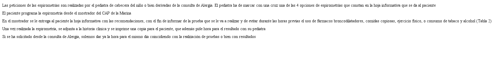 Las espirometrías las solicita el pediatra de referencia o la pediatra encargada de la consulta de alergia de nuestro centro, siguiendo el circuito creado para ello (Tabla 1). Una vez se ha realizado la petición, se programa el día de la espirometría y se entrega una hoja de recomendaciones para el día de la cita a los padres. En esta hoja se dan indicaciones con el fin de evitar durante las horas previas el uso de fármacos broncodilatadores, comidas copiosas, ejercicio físico, tabaco y alcohol, en caso de adolescentes (Tabla 2).