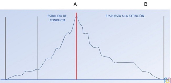 La extinción (Fig. 1) produce habitualmente en los primeros momentos, un incremento (A), en la frecuencia e intensidad de la conducta que queremos eliminar, la cual terminará desapareciendo si se mantiene la ausencia de consecuencias reforzantes de forma consistente (B).