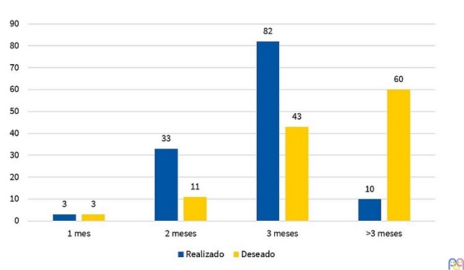 Los residentes de Pediatría rotan en AP mayoritariamente en los dos primeros años (72%) y tan solo un 28% realizan la rotación en la segunda mitad de la residencia. Un 15% de los encuestados rotan por AP en dos periodos. El 51% consideran que el tiempo de rotación adecuado sería cuatro meses y tan solo un 11% consideran adecuado rotar menos de tres meses. En la Fig. 1 podemos observar el número de respuestas sobre el número de meses que realizan de formación por AP y los meses que desearían rotar para que la formación fuera más completa.