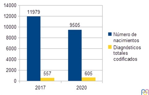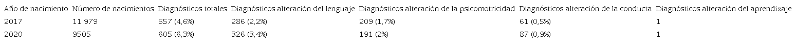 La muestra incluida fue de 11 979 niños y niñas nacidos en el año 2017 y 9505 nacidos en el año 2020, haciendo un total de 21 484 individuos nacidos en estos años en la Comunidad Autónoma de Aragón, y que fueron incluidos en el sistema de salud público. En la muestra de niños nacidos en el año 2017 se incluyeron los diagnósticos codificados hasta diciembre del año 2019; y en los nacidos en el año 2020, los codificados hasta diciembre del año 2022. Durante estos periodos de tiempo se codificaron en el programa informático de Atención Primaria 1162 episodios de trastorno del neurodesarrollo. La Figura 1 muestra la distribución de los nacimientos y del número de diagnósticos realizados cada año.