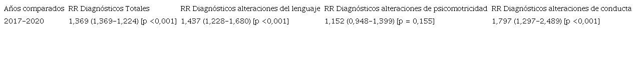 Se analizaron los datos con el fin de obtener el riesgo relativo de padecer un trastorno del neurodesarrollo en función del momento de nacimiento, prepandemia o pandemia. Los resultados mostraron un riesgo relativo en los nacidos en el año 2020 frente a los nacidos en 2017 de presentar una alteración del neurodesarrollo de 1,369 (IC 95%: 1,224-1,531; p <0,001). Al analizar de forma independiente las cuatro áreas del desarrollo neurológico, se observa un aumento del riesgo relativo de todas ellas, excepto en el aprendizaje. En el caso de las alteraciones del lenguaje, el riesgo relativo en el grupo pandémico de desarrollar un trastorno es de 1,437 (IC 95%: 1,228-1,680; p <0,001); y en las alteraciones de conducta es aún mayor, 1,797 (IC 95%: 1,297-2,489; p <0,001). El riesgo relativo de desarrollar un trastorno en el área psicomotriz en el grupo pandémico frente al prepandémico en nuestra muestra no obtuvo resultados estadísticamente significativos, 1,152 (IC 95%: 0,948-1,399; p 0,155). Los datos se encuentran reflejados en la Tabla 2.